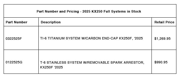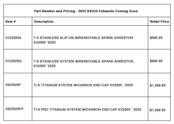 CORONA, CA - May 7, 2025 - For all the 2025 Kawasaki KX250 owners out there, we've just received two of our models in stock! The Ti-6 Titanium Exhaust System delivers top-tier performance with a light-weight titanium build and a sleek carbon fiber end-cap - perfect for serious racers who want pro-level looks and durability. For those who prioritize performance and rugged durability, the T-6 Stainless Steel Exhaust System offers the same race-ready gains with stainless steel and aluminum construction. Both systems meet AMA amateur sound requirements and include a USFS-approved spark arrestor, making it easy to switch from track to trail.
