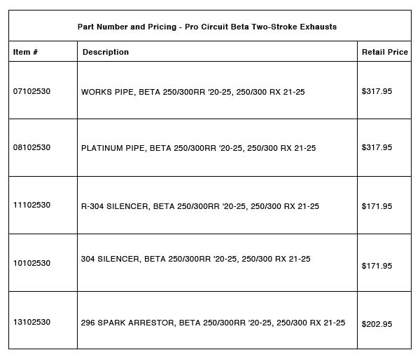 CORONA, CA - July 14, 2025 - It's time to update your Beta 250/300RR (2020-2025) and RX (2021-2025). Pro Circuit offers two high-performance exhaust options that deliver serious gains across the entire RPM range. The Original Works Pipe features raw, stamped carbon steel contruction with hand-welded seams and reinforced brackets providing a factory-level power boost and a true "Works Look" - perfect for riders who want unmatched performance and don't mind a bit of maintenance. The Platinum Pipe delivers the same perfromance with the added benefit of electoless nickel plating, extending the pipe's life by up to 10x and offering corrosion resistance with a sleek, polished finish. Both pipes are handcrafted in the USA.